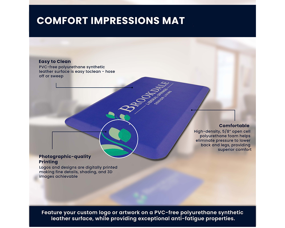 Comfort Impressions mats feature your custom logo or artwork on a PVC-free polyurethane synthetic leather surface, while also providing the benefits that a regular anti-fatigue mat does.